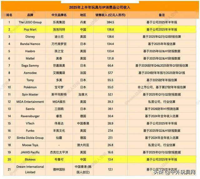 2025 上半年全球玩具行业格局生变,中国品牌泡泡玛特以 138.76 亿元人民币玩具营收,超越迪士尼(138.6 亿元)及万代南梦宫,跻身全球第二,仅次于乐高。其营收同比激增 204.4%,半年业绩已超 2024 全年,LABUBU系列IP贡献高达48.1亿元。