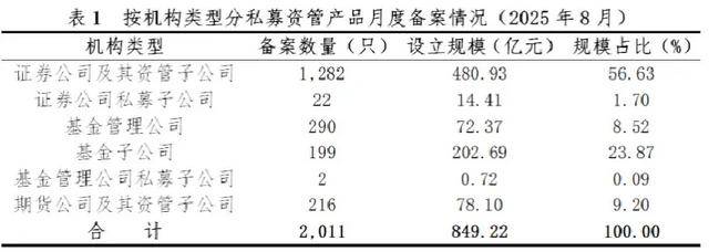在5类机构中,证券公司及资管子公司8月私募资管产品备案数量、设立规模均排第一,共计备案1282只、设立规模480.93亿元,规模占比超五成。