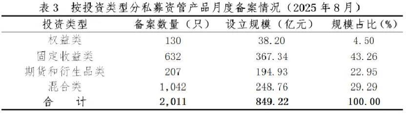 具体来看,混合类、固定收益类、期货和衍生品类、权益类,今年8月分别备案了1042只、632只、207只、130只,设立规模依次为248.76亿元、367.34亿元、194.63亿元、38.2亿元,规模占比分别为29.29%、43.26%、22.95%、4.5%。