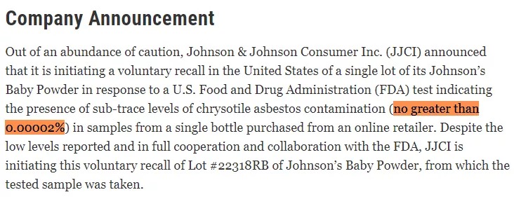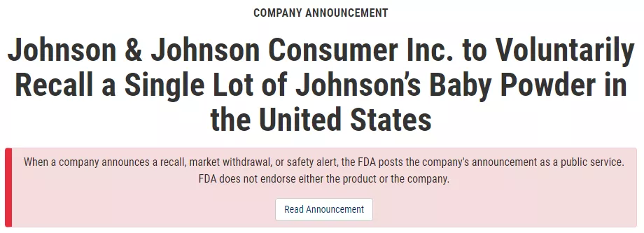 美国当地时间2019年10月18日,强生发布声明称,美国食品药品监管局(FDA)在一瓶强生婴儿用爽身粉内检测出含有石棉。声明强调,本次召回的婴儿爽身粉仅在美国地区生产并销售,被检测出含有石棉的那瓶爽身粉,是FDA通过网上零售商途径购得,石棉含量不超过0.00002%